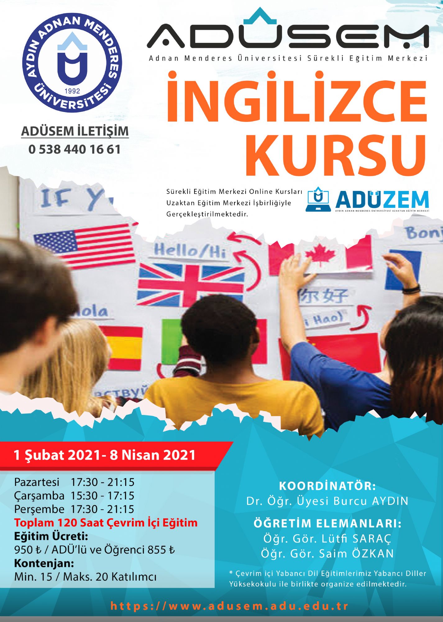 ADÜSEM: 0538 440 16 61 0256 2182000-2772 Yabancı Diller YO Telefon (Santral): 0256 2182000 Dahili: 4604 / 4605 |