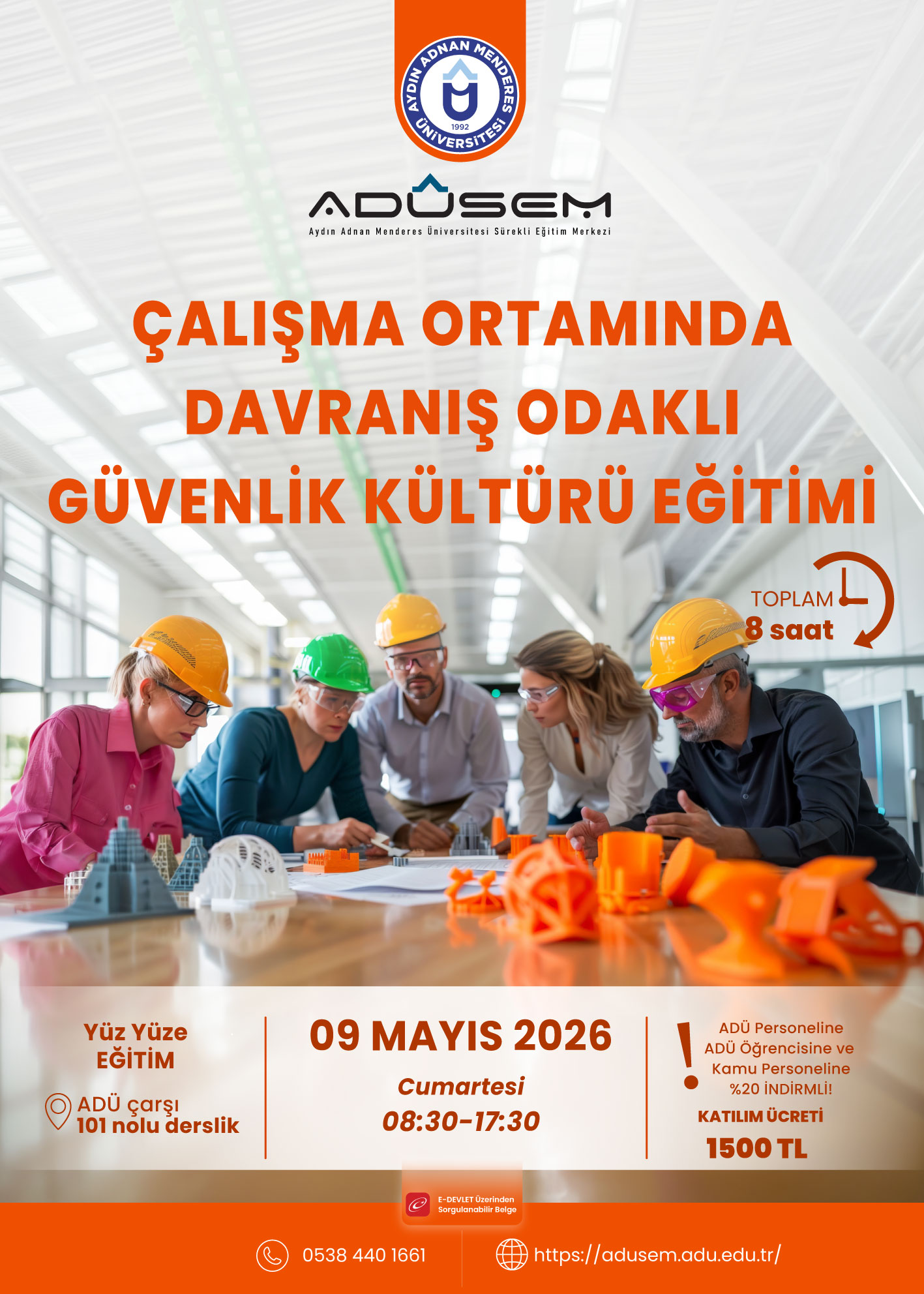 | 08.30 - 10.30 | Çalışma Hayatının Esasları, İş Sağlığı ve Güvenliğine Giriş ve Güvenlik Kültürü - Davranış Odaklı Güvenlik (Behavior Based Safety) Kavramı |
