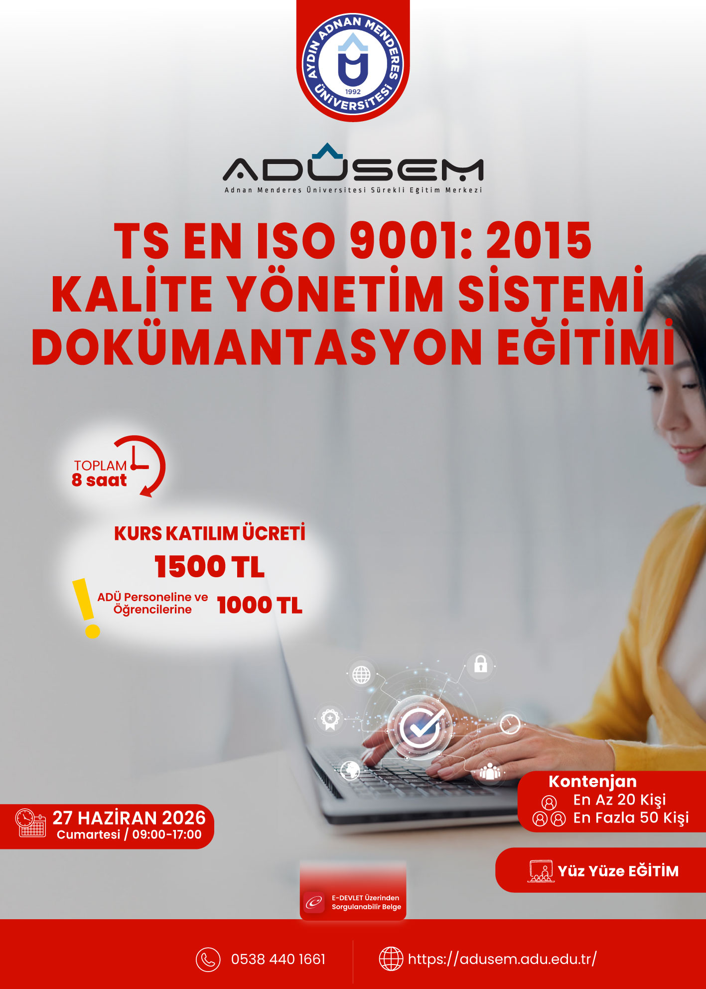 TS EN ISO 9001:2015 Kalite Yönetim Sistemi uygulamaları kapsamında, sistem dokümantasyonunun planlanması, oluşturulması, uygulanması ve sonuçlarının izlenmesine yönelik gerekli kuramsal bilgi ve uygulama esaslarının katılımcılara aktarılması amaçlanmaktadır. Eğitim sürecinde, dokümante edilmiş bilgiye ilişkin gereklilikler, etkin dokümantasyon yönetimi ilkeleri ve bu süreçlerin kalite yönetim sistemi içerisindeki işlevi akademik bir yaklaşımla ele alınacaktır.